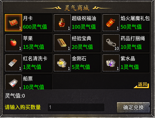 攒够600灵气值即可兑换月卡(与充值购买得月卡没有任何区别,奖励一样不少)
