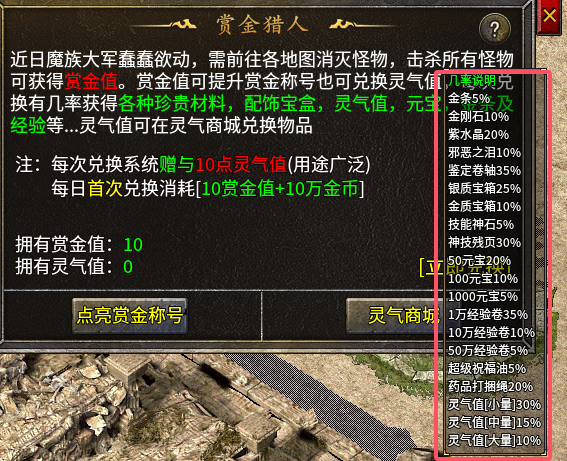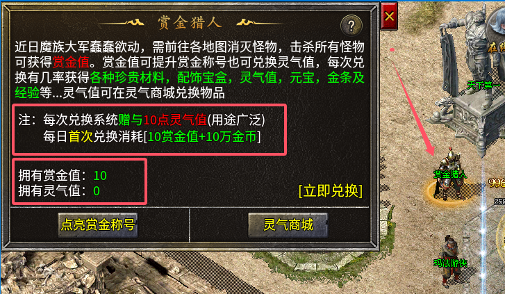 每天首次兑换灵气值消耗10赏金值+10W金币,后续是10赏金值+200元宝进行兑换