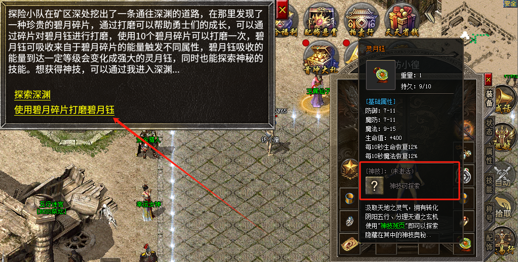 打怪获取碧月碎片提升玉佩等级,碧月钰达到6级之后质变为灵月钰,质变之后即可神技探索,数十种类的神技,