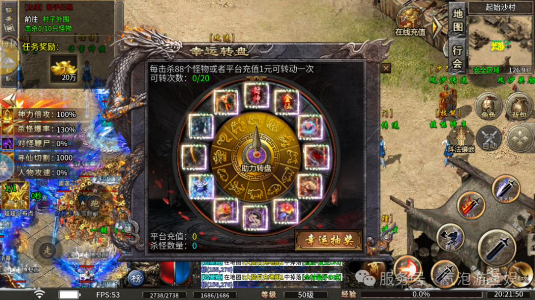 土城右上角设有幸运转盘,打怪88个或者有条件的大哥每充值1元就可以参与抽奖,最高可参与20次抽奖,20次保底必出2000元的封神会员顶赞卡,前期快速开荒