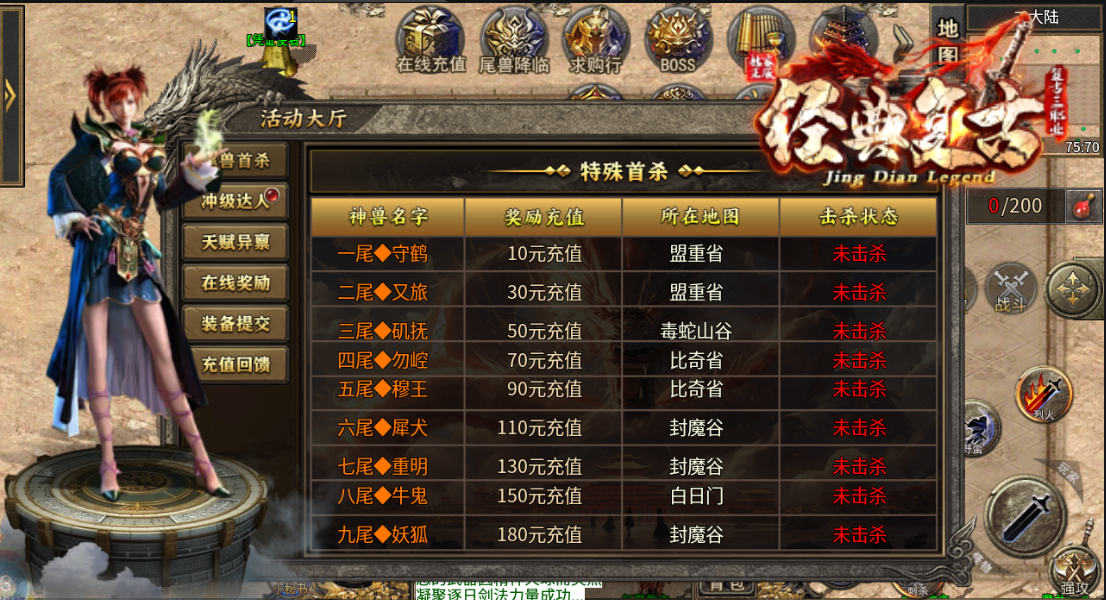 1、新人上线第一步,先去做完第一个主线任务送三职业基础技能,召唤神兽,烈火剑法,冰咆哮。