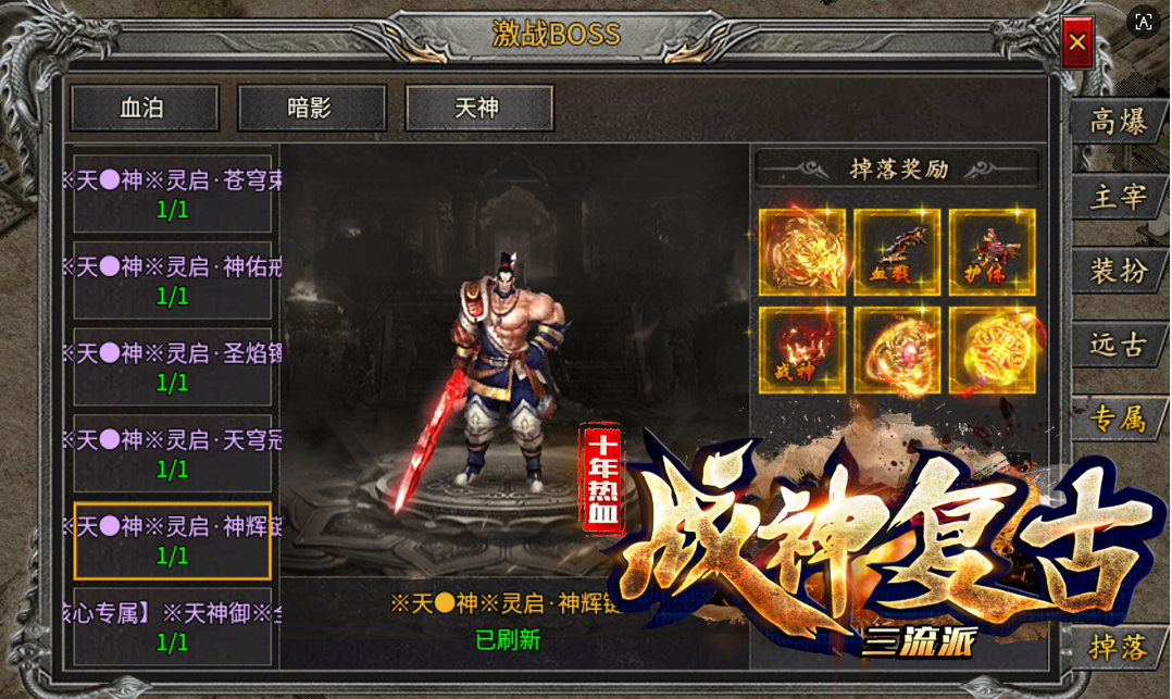 活动栏上方激战boss 可打出各类专属装备,新区第三天开放专属boss